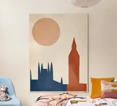 "Explore Berlin" geeft de geest van de stad weer in een levendige retrocompositie. Met de iconische Fernsehturm (TV-toren), een vintage fiets en gedurfde architecturale kleurblokken is dit kunstwerk perfect voor liefhebbers van Berlijn, stedelijk design en reisgeïnspireerde interieurs.