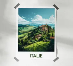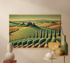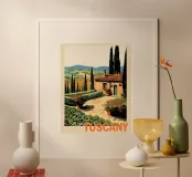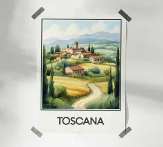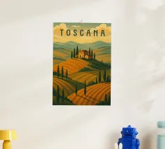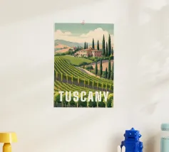 Deze poster in retrostijl benadrukt de betoverende schoonheid van Toscane met glooiende heuvels, cipressen en een warme gouden lucht. De vetgedrukte tekst "Explore TUSCANY" nodigt uit tot avontuur en combineert vintage texturen en aardetinten. Perfect voor reisinspiratie of als decor voor natuur- en cultuurliefhebbers.
