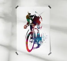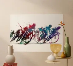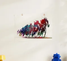 Ervaar de dynamische energie van een groep fietsers in deze tekening in Banksy-stijl. Gedurfde sjablonen en opvallende contrasten vangen de essentie van beweging en stedelijke straatkunst