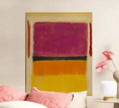 Het grote motief combineert vloeiende kleurvlakken in roze, oranje en beige, geïnspireerd door Mark Rothko. Geometrische vierkanten en dynamische penseelstreken creëren een moderne, abstracte compositie die fungeert als een indrukwekkend kunstwerk in het interieur. De vervagende kleuren nodigen de kijker uit om er emotioneel bij betrokken te raken.