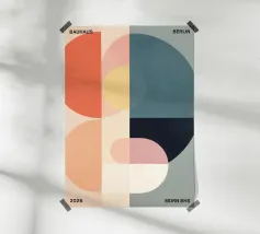 Duidelijke poster in moderne Bauhaus-stijl. Geometrische vormen in rood, blauw, goud en beige vormen een evenwichtige compositie op een lichtgekleurde achtergrond. Geïnspireerd door klassieke designesthetiek - minimalistisch, krachtig en tijdloos. Ideaal voor moderne interieurs.