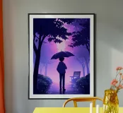 Een jongen met paraplu in een park in de nacht regen Lofi Art poster met aluminium frame