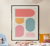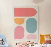 Abstracte geometrische vormen in zachte pastelkleuren creëren een harmonieus en modern ontwerp. De opstelling van halve cirkels, rechthoeken en ovalen voegt een intrigerend evenwicht toe aan de compositie.