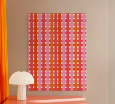 Een repeterend patroon van kruisende lijnen creëert een raster met afwisselende kleuren groen, roze en oranje. Het geometrische ontwerp vormt een visueel evenwichtig en symmetrisch effect.