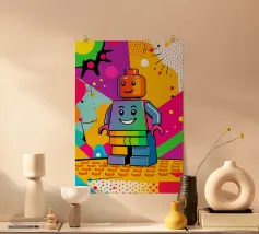 Een speelse retro-inktillustratie van marcherende robots tegen een achtergrond van levendige kleuren en gedurfde geometrische vormen. Het werk viert nieuwsgierigheid, ritme en het eigenzinnige optimisme van een wereld die wordt aangedreven door verbeelding.