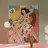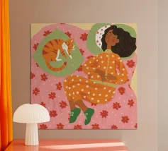 Dit kunstwerk toont een persoon die op een stoel ligt en een jurk draagt met een bladmotief. De achtergrond bevat verschillende grillige elementen zoals een kat en abstracte vormen, waardoor een speels en ontspannen tafereel ontstaat.