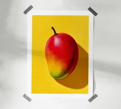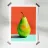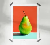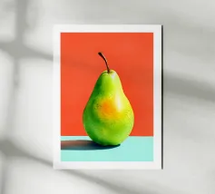 Levendige illustratie van een rijpe groene peer op een turquoise oppervlak tegen een knaloranje achtergrond. Deze moderne keukenprint voegt een frisse, fruitige kleur toe aan je kookruimte en geeft een speels, eigentijds accent aan je eethoek of ontbijtruimte.