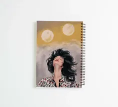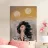Een dramatisch portret van een vrouw met donker, winderig haar die omhoog staart, haar blouse met patroon subtiel zichtbaar, tegen een donkere achtergrond met twee lichtgele hemelbollen.