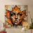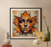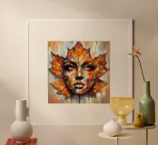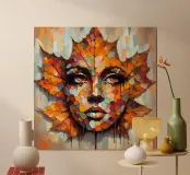 Acrylschilderij van een gezicht dat tevoorschijn komt met een uitbarsting van vurig oranje, warm rood en zachte gouden kleuren. Dit blad is niet alleen maar decoratie - het vormt de contouren van een droevig maar sereen gezicht, alsof de geest van de herfst zelf een menselijke vorm heeft aangenomen.
