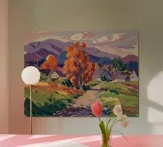 Een warm en uitnodigend herfstlandschap met een gezellig dorp met opvallende huizen met oranje daken, omringd door bomen in rijke herfstkleuren, met in de verte paarse heuvels in silhouetten tegen een stralende zonsondergang.