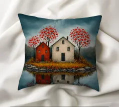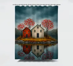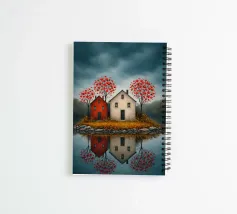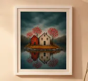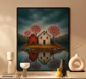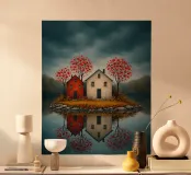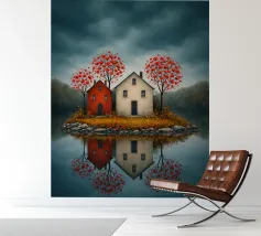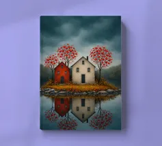 Op het stille water rijst het eerste eiland op, twee rustige huizen, rode bloesems in de wind; ze fluisteren over verre oorden waar de avond zacht en vriendelijk valt. In hun weerspiegeling vindt de geest rust, als een boot die vergeet hoe hij moet varen; melancholie verzacht tot licht, en het hart leert de betekenis van thuis.