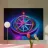 Illustration of a compass on a black background with a pink and blue wind rose and an arrow pointing to north.