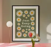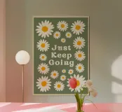 Opbeurende en retro motiverende kunstdruk met de zin "Just Keep Going" omringd door charmante witte en gele madeliefjes. De donkere saliegroene achtergrond en de verweerde textuur geven het een coole vintage jaren 70 uitstraling. Perfect voor een studentenkamer, kantoor aan huis of slaapkamer. Retro Bloemsierkunst, Gewoon Blijven Gaan, 70s Esthetische Poster, Madeliefje Muurkunst, Groovy Motivatie Print, Saliegroen Deco, Vintage Hippie Vibe, Inspiratiecitaat