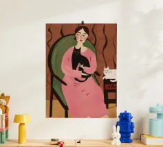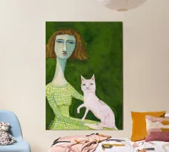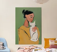 This illustration shows a person in a striped dress, sitting with a cat on the lap. The background features large green leaves, creating a tranquil and serene environment.
