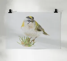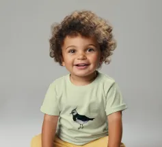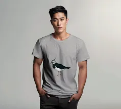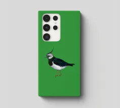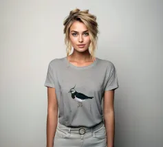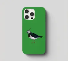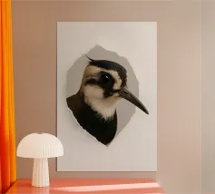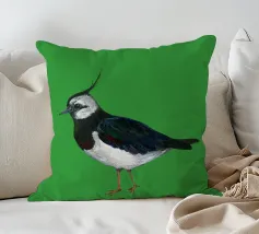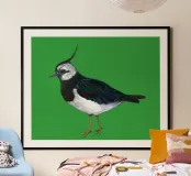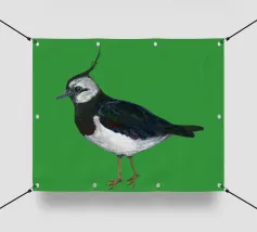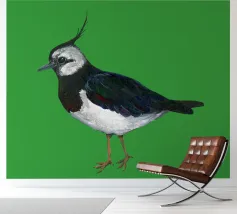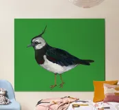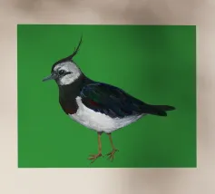 Een acrylschilderij van een kievit. De vogel loopt. Je ziet de vogel vanaf de zijkant. Hij kijkt naar links. Schattig