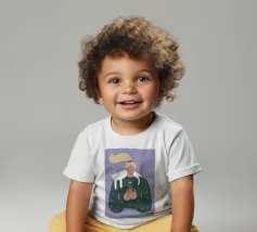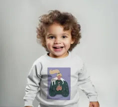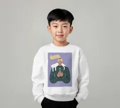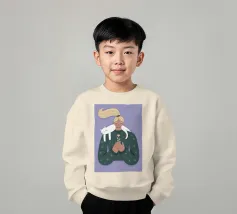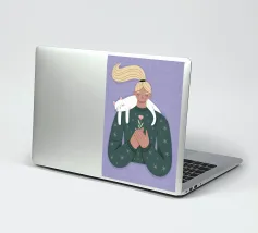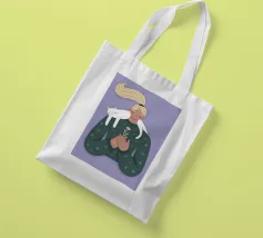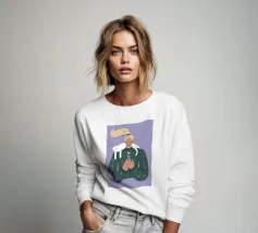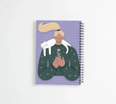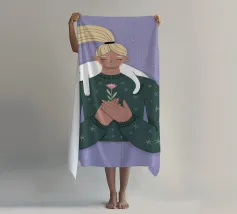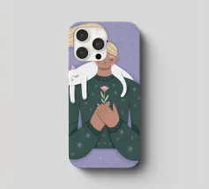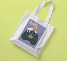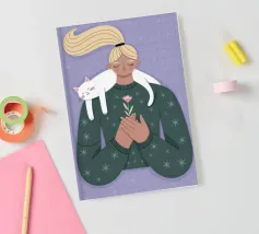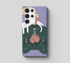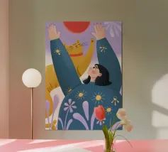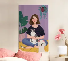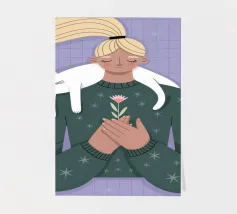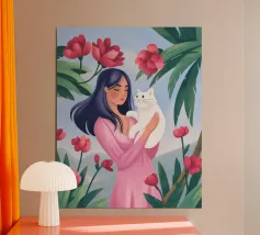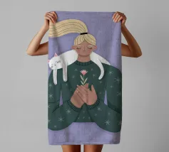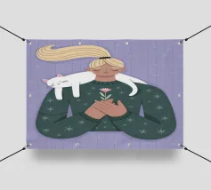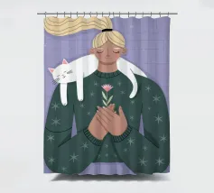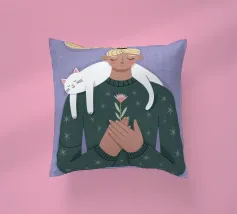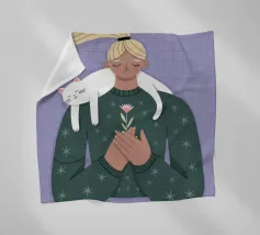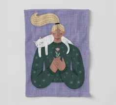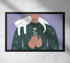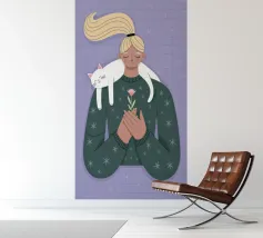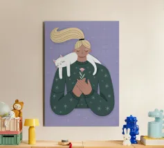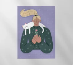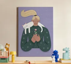 Dit schilderij toont een persoon met blond haar die een groene trui met witte sterren draagt en een witte kat vasthoudt. De achtergrond is lichtpaars met een rasterpatroon, waardoor een knus en rustgevend tafereel ontstaat.