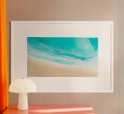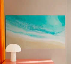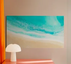 A calming aerial view of ocean waves gently meeting sandy shore. Turquoise layers and soft textures bring a breezy coastal feel, perfect for brightening beach homes, modern interiors, or spa-inspired spaces with a fresh and tranquil energy.