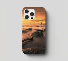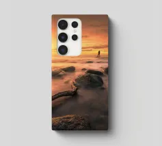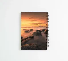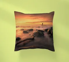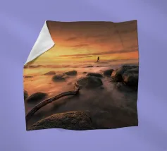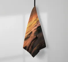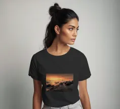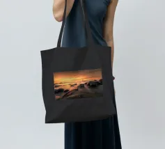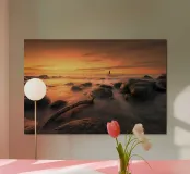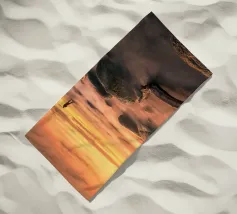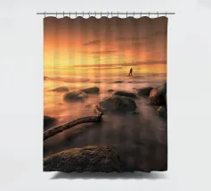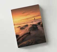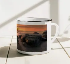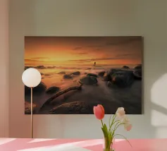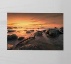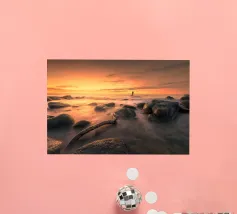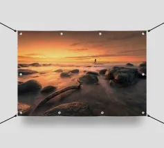 De zee spoelt zachtjes tegen de rotsen, terwijl de hemel baadt in een gouden gloed. Een sfeervolle muurschildering voor iedereen die houdt van de kust en avondkleuren.