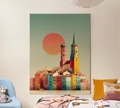 Stap in de serene schoonheid van Japan met deze minimalistische reisposter geïnspireerd door de iconische pagode tempels van Kyoto. Met gedurfde geometrische vormen, overlappende zon- en maancirkels en rijke groenrode tinten combineert dit kunstwerk modern design met traditionele rust. Perfect als muurprint voor liefhebbers van de Japanse cultuur, zen-decor en grafische reiskunst. Een opvallend statement voor elke ruimte.