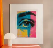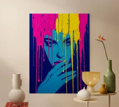 Deze levendige, kleurrijke illustratie toont een intens menselijk oog dat samensmelt met spatten blauw, geel en roze, waardoor een gevoel van energie en beweging ontstaat. De fijne lijnen van het gezicht en het oog worden gecontrasteerd met abstracte verfspatten, waardoor het kunstwerk een eigentijdse en dynamische uitstraling krijgt. Een perfecte keuze voor het toevoegen van een gedurfde en opvallende artistieke touch aan je woonruimte, waarbij expressie en emotie worden benadrukt door levendige kleuren.