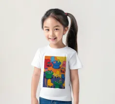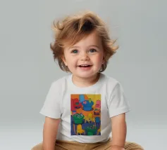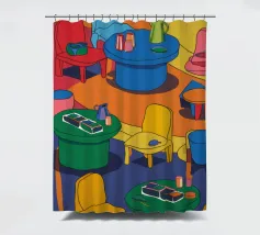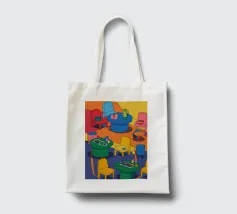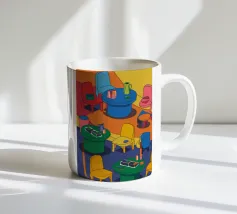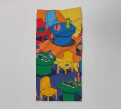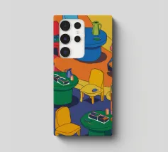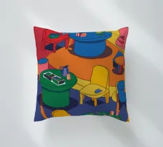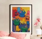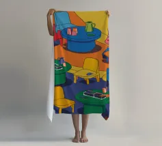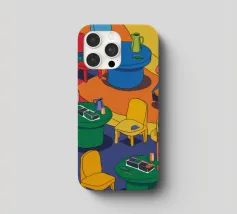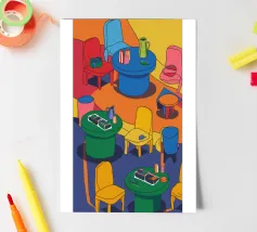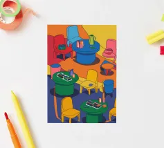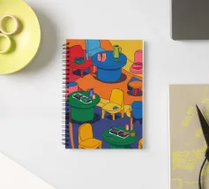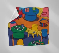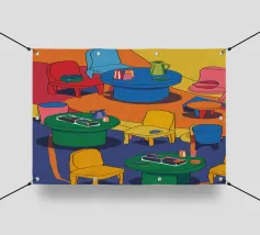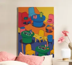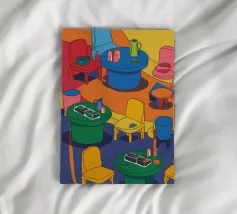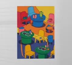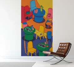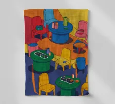 A lively, bird eye view of a bustling diner or cafe, filled with colorful tables, chairs, and patrons, depicted in a playful, modern illustration style.