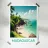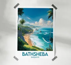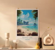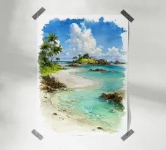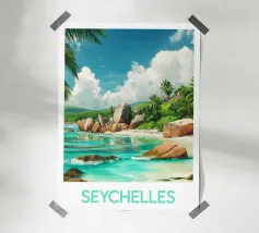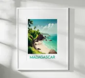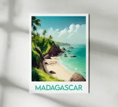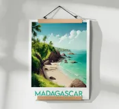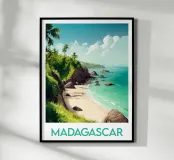 Affiche de Madagascar mettant en scène une plage paradisiaque bordée de palmiers, de rochers et d’eaux turquoise. Une décoration murale dépaysante qui évoque l’évasion, la nature et la beauté sauvage de l’océan Indien.