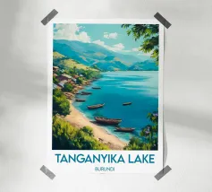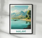 Poster uit Malawi met een vredig strand met traditionele boten tegen een achtergrond van majestueuze bergen. Een zachte en inspirerende wanddecoratie die de rust, natuur en wilde schoonheid van Afrika oproept.