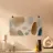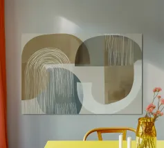 Een luchtig abstract landschap geïnspireerd door de natuurlijke stroom van kustlijnen en verschuivend zand. Zachte aardetinten, gedempt groen en vloeiende witte lijnen roepen een gevoel van wind en open ruimte op. Perfect voor minimalistische, kust- of moderne organische interieurs.