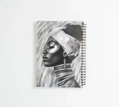 Een opvallend zwart-wit portret van een Afrikaanse vrouw in zijaanzicht, versierd met elegante sieraden, benadrukt haar prachtige gelaatstrekken. De korrelige textuur van het beeld benadrukt de kracht en schoonheid van de mode, vastgelegd in een moderne, betoverende stijl.