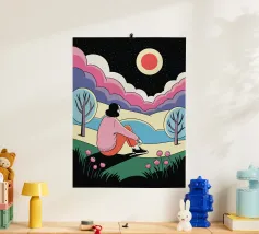 Breng een vleugje kunstzinnige magie in je huis met deze “Moonbeam” kunstdruk. Dit schilderij, gemaakt door de getalenteerde Arty Guava, vangt de serene atmosfeer van een nacht onder de sterrenhemel met een dromerige vrouw aan een tafel. Het is perfect voor iedereen die zijn interieur een creatieve boost wil geven. Deze print past uitstekend in de woonkamer, slaapkamer of zelfs een kantoorruimte. Het gebruik van levendige kleuren en een speelse stijl maakt het een aantrekkelijke aanvulling voor elke moderne inrichting. Deze kunst print is niet alleen een visuele traktatie, maar stimuleert ook de verbeelding en inspireert tot dagdromen. Perfect als cadeau voor kunstliefhebbers of voor jezelf!