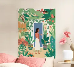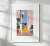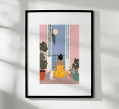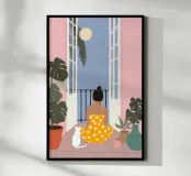 Een rustige avondscène van een vrouw en haar kat zittend bij open deuren, omringd door weelderige planten en zacht maanlicht. De zachte compositie voelt dromerig en vrouwelijk met strakke lijnen en pastelkleuren. Gemaakt om een beetje stilte en langzame levensenergie in je dag te brengen.