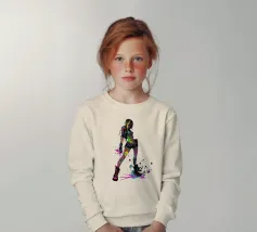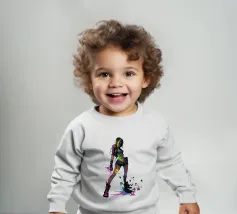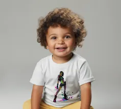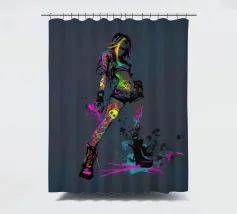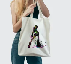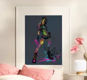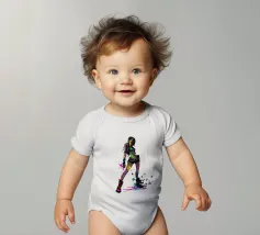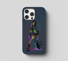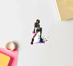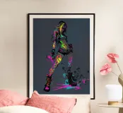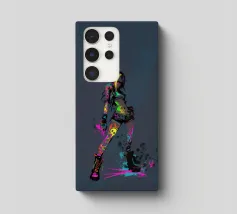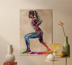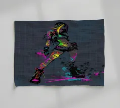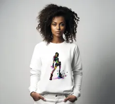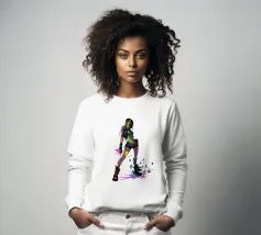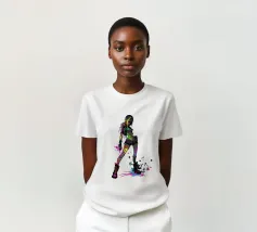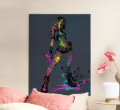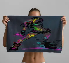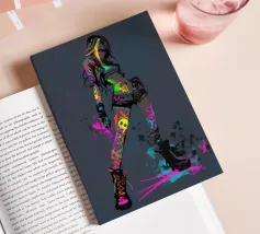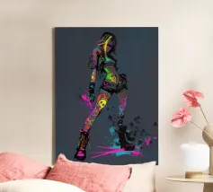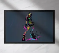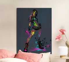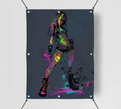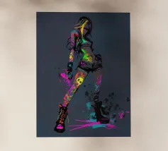 Een krachtige, eigentijdse illustratie vol attitude, beweging en kleur. Een zelfverzekerde figuur staat midden in een stap, haar silhouet steekt scherp af tegen een neutrale achtergrond, terwijl neonkleuren als rauwe energie over haar lichaam spatten. Graffitachtige tekens, spatten en symbolen doen de grens tussen mode, straatkunst en expressie vervagen en geven het werk een onrustige, uitdagende uitstraling.