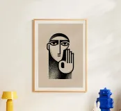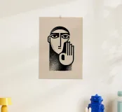 A refined, minimalist portrait built from bold geometry and restrained contrast. A simplified face and raised hand form a quiet, iconic gesture that suggests pause, listening, or reflection. Clean lines and carefully placed texture give the image a timeless, graphic quality, balancing clarity with subtle emotional depth.