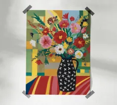 Een levendig boeket kleurrijke bloemen is gerangschikt in een vaas versierd met een patchwork van verschillende patronen, waardoor een uniek en artistiek bloemstilleven ontstaat.