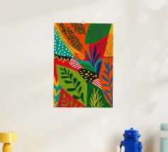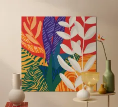 Een levendige, abstracte compositie van gestileerde junglebladeren en gedurfde, moderne patronen. Het stuk is een dynamische, chique en energieke fusie van natuurlijke vormen en grafisch ontwerp.