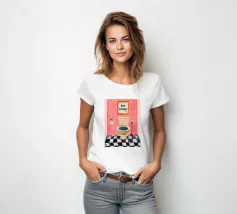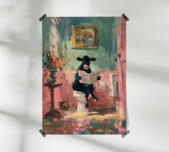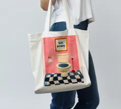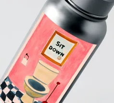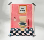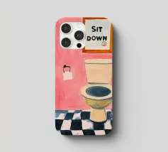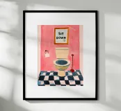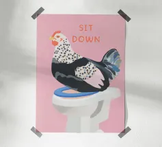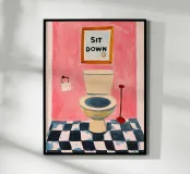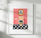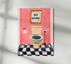 Een humoristische illustratie voor het gastentoilet: "Ga zitten, niet staand plassen!" - In trendy kleuren en minimalistisch ontwerp, perfect voor een moderne badkamer.