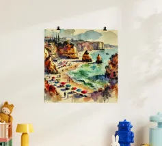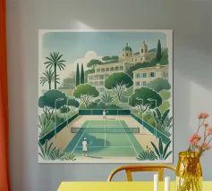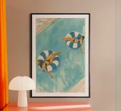 Bring summer vibes into your space with this vibrant acrylic-style poster featuring two women relaxing on blue-and-white striped float rings in a turquoise pool. Perfect for adding a touch of retro charm and warmth to your home or office décor.