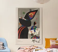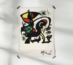 Joan Miró was een Spaanse schilder, beeldhouwer en keramist die in 1893 in Barcelona werd geboren. Miró stond bekend om zijn speelse en fantasierijke stijl en mengde elementen uit het surrealisme, dada en abstracte kunst. Zijn werk wordt vaak gekenmerkt door felle kleuren, organische vormen en droomachtige beelden die een diepe verbinding met het onderbewustzijn weerspiegelen. Miró's kunst tartte traditionele technieken en inspireerde generaties met zijn gevoel van vrijheid en creativiteit. Hij wordt beschouwd als een van de meest invloedrijke kunstenaars van de 20e eeuw.