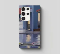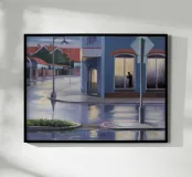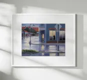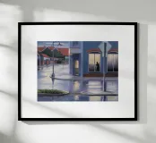 Viewed from a car, a lone figure is silhouetted in a doorway across a rain slicked street. The scene, with its wet reflections and moody lighting, evokes a sense of melancholy, mystery, and urban solitude.