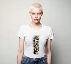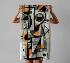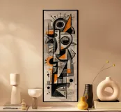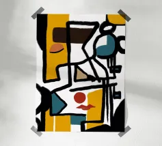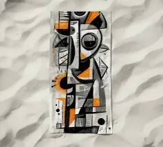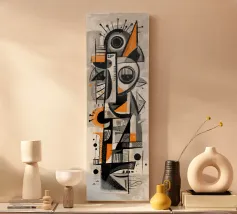 Een opvallende abstracte compositie opgebouwd uit gelaagde geometrie, gestructureerde markeringen en ritmische contrasten. Fragmentarische vormen komen samen in een totemachtige, bijna maskerachtige vorm, waarbij precisie en spontaniteit in evenwicht zijn. Gedempte grijstinten en gebroken wit vormen de basis, geaccentueerd door gedurfde accenten die het oog verticaal door het werk leiden en een gevoel van structuur, beweging en rustige intensiteit creëren.
