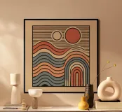 Het ontwerp "Retro Waves" combineert minimalistisch design met een vleugje nostalgie. Het is geïnspireerd op de esthetiek van de jaren 70 en 80 en biedt zachte, gebogen lijnen die doen denken aan zonsondergangen, weidse horizonten en kalme oceaangolven. De subtiele, contrasterende kleuren in combinatie met eenvoudige geometrische vormen creëren een rustgevend maar krachtig effect.