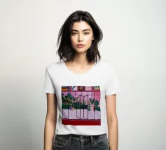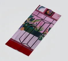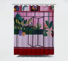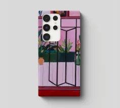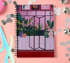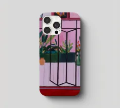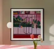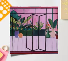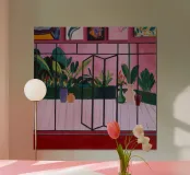 Viewed through an interior window or doorway with distinct pink framing, a collection of potted green plants thrives on a patterned floor against a soft pink wall.