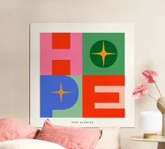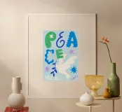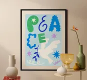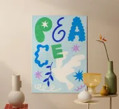 Moderne illustratie met vredige symboliek: een witte duif met een olijftak symboliseert hoop, harmonie en vertrouwen. De speelse typografie, zachte blauwe tinten en decoratieve vormen geven de poster een kalme, positieve uitstraling. Ideaal voor woonkamers, slaapkamers of meditatieruimtes - perfect voor iedereen die verlangt naar evenwicht en innerlijke rust. Eigentijdse illustratie in een moderne kunststijl met spirituele lichtheid.