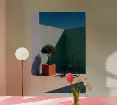 Rustige binnenplaats met zonlicht dat schaduwen werpt poster