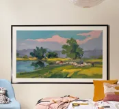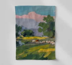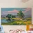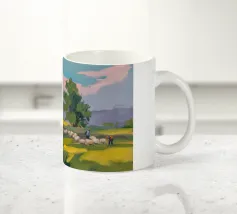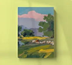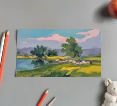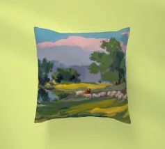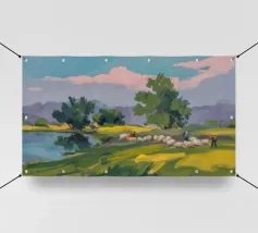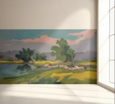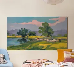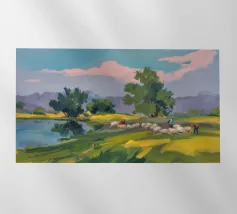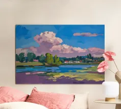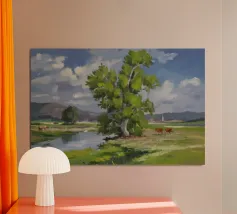 Een landschapsschilderij van een rustig meer met een grasland op de voorgrond en bomen aan de overkant. De lucht is zachtblauw met lichte wolken.
