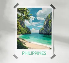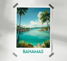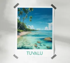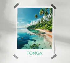 Reisposter die een paradijselijk strand in Samoa illustreert, omzoomd met weelderige palmbomen, goudkleurig zand en sprankelend turquoise water. Een perfecte illustratie om een tropische, rustgevende en exotische sfeer aan je muurdecoratie toe te voegen.