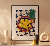 Een helder stilleven met een schaal vol gele citroenen op een blauw-wit geruit tafelkleed, naast een boek en een plant.