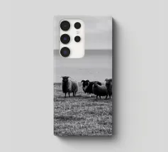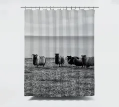 Decoratieve zwart-witfoto van een wilde schapenfamilie in de natuur.
