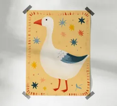 De afbeelding toont een minimalistische zeemeeuwillustratie met een heldere, grafische stijl. De meeuw heeft een wit lichaam, blauwe vleugels met witte accenten en een gele snavel en poten. De achtergrond is blauw, wat een mooi contrast vormt met de witte meeuw. De stijl is eenvoudig, modern en decoratief, met een gereduceerd kleurenpalet en strakke lijnen - bijna als een gestileerd logo of moderne muurkunst. Een prachtig voorbeeld van grafisch ontwerp!