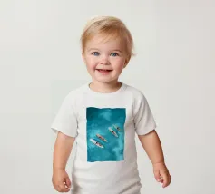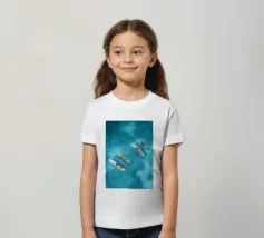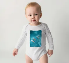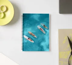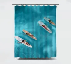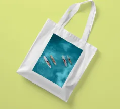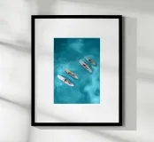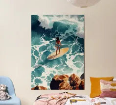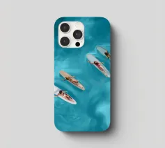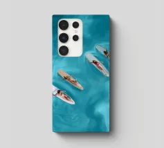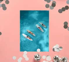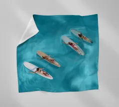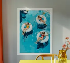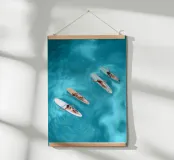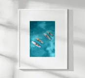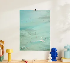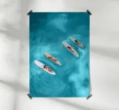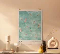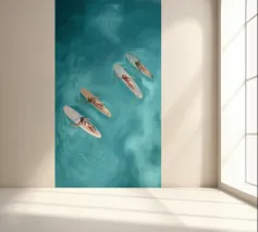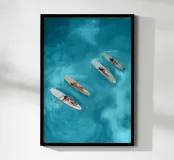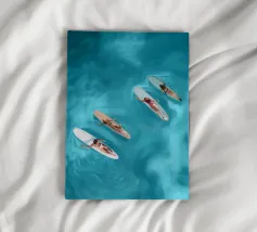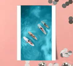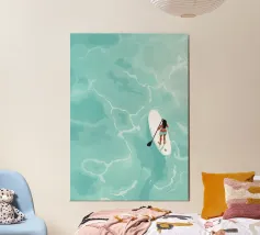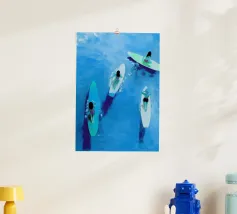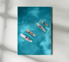 Een luchtschilderij dat een rustig moment van oceaanrust vastlegt. Vier vrouwen op longboards glijden over rustig turquoise water, hun lichamen ontspannen, peddelend door zonverlichte rimpelingen. De compositie is een balans tussen vloeiende beweging en stilte, waarbij zachte verlopen en subtiele reflecties het vredige ritme van het surfleven oproepen. Een viering van de vrouwelijke surfcultuur, vrijheid en verbondenheid met de zee - dit werk straalt warme kustenergie en tijdloze zomervibes uit.